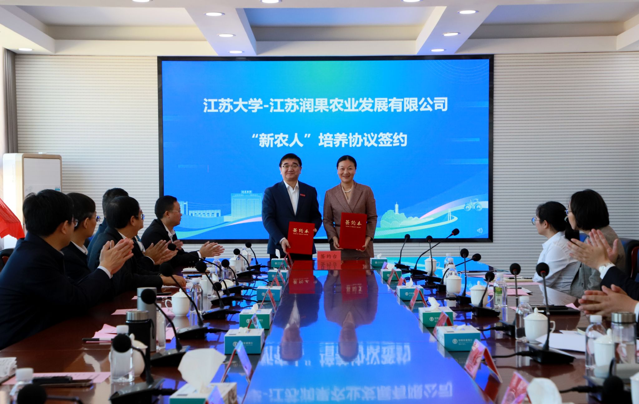 江苏大学教务处处长尹必峰与江苏润果农业发展有限公司董事长魏巧签约江苏大学-江苏润果农业发展有限公司“新农人”培养协议。
