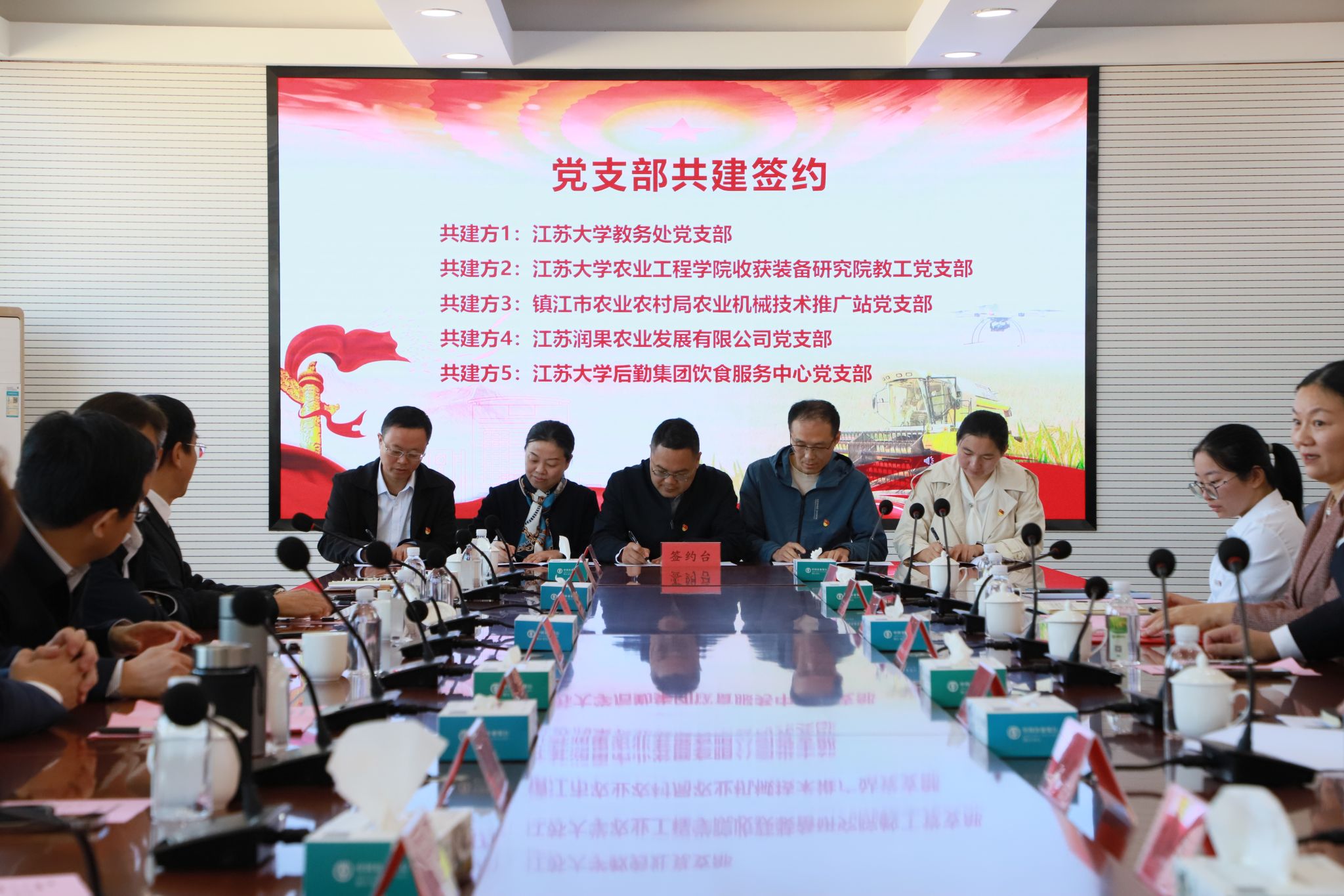 江苏大学教务处党支部、华亿在线体育收获装备研究院教工党支部、镇江市农业农村局农业机械技术推广站党支部、江苏润果农业发展有限公司党支部、江苏大学后勤集团饮食服务中心党支部,围绕农业“强国行”、“新农人”培养等内容,开展党建共建。