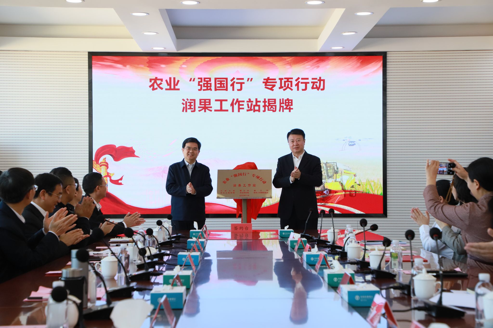 江苏大学党委书记李洪波与镇江经济技术开发区党工委书记、管委会主任李朝阳为农业“强国行”专项行动润果工作站揭牌。